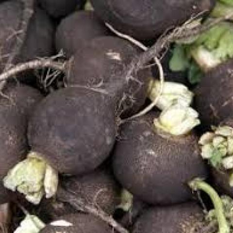 Radis à racine ronde, noire foncé à chair ferme et blanche, d'excellente qualité gustative.